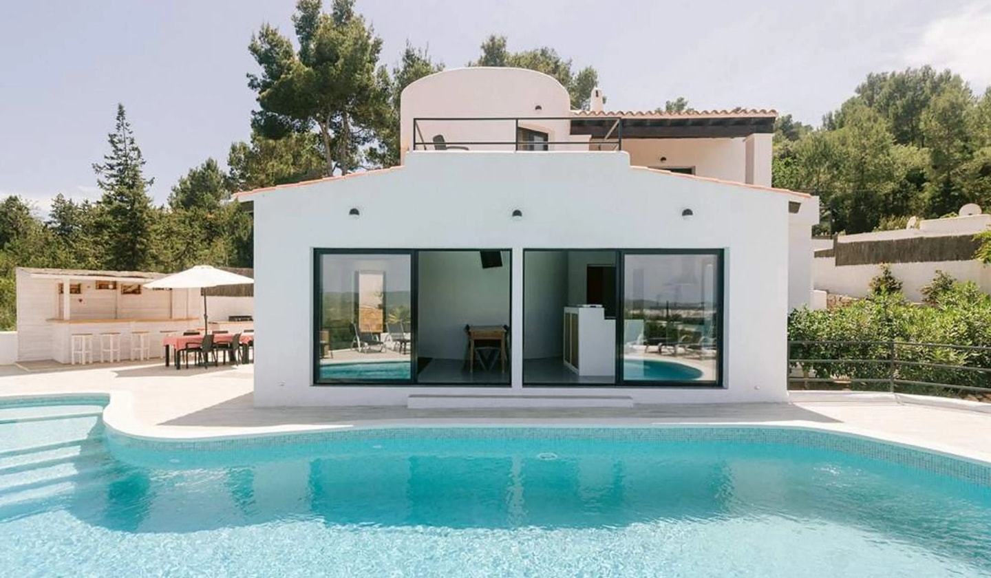 Eine Finca an der Westküste mit Poolbar und Blick über die Bucht von San Antonio. Fünf Schlafzimmer und ein Studio bieten Platz für Familienfeiern im unberührten Ibiza.