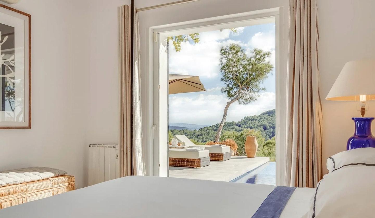 Das Interieur besticht durch eine warme, halboffene Raumaufteilung, in der die Wohnbereiche nahtlos ineinander übergehen. Drei Schlafzimmer auf zwei Etagen bieten flexible Unterkunftsmöglichkeiten, wobei die beiden Zimmer im Erdgeschoss direkt zum Garten und zum Poolbereich hin offen sind. Das obere Schlafzimmer verfügt über eine eigene Terrasse, die einen weiteren Aussichtspunkt für den weiten Blick auf die Hügel und das Meer bietet. Die gut ausgestattete Küche verfügt über einen Geschirrspüler, einen Backofen, eine Mikrowelle und einen Gefrierschrank sowie moderne Annehmlichkeiten.