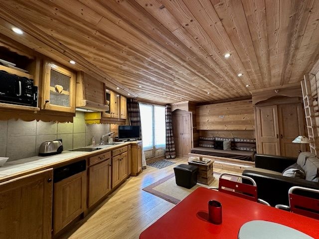 Das Wohnen im Erdgeschoss des Crystallines-Gebäudes in Val d'Isère bietet eine andere Perspektive auf den Aufenthalt in den Bergen. Diese 37 Quadratmeter große Wohnung befindet sich am ruhigeren unteren Ende der Stadt, wo das Tempo langsamer und die Menschenmengen dünner werden. Sie ist eine praktische Wahl für Paare, die eine saisonale Unterkunft suchen, und bietet alles Notwendige ohne unnötigen Schnickschnack. Die einstöckige Aufteilung macht das Kommen und Gehen besonders nach langen Tagen auf der Piste angenehm unkompliziert.