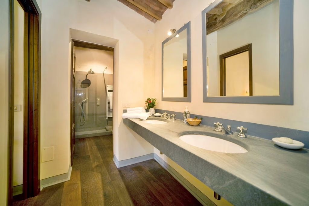 Im Erdgeschoss befinden sich drei Schlafzimmer, die sich zwei Badezimmer teilen, während der Turm die Master-Suite beherbergt. Das kürzlich renovierte Obergeschoss verfügt über ein Wohnzimmer und ein Doppelzimmer mit eigenem Bad, die alle mit einer Klimaanlage ausgestattet sind. Die alte Küche des Anwesens kann zum Schauplatz für traditionelle toskanische Abendessen werden, die von lokalen Mitarbeitern zubereitet werden, falls Sie einen Abend mit regionalen Spezialitäten genießen möchten, ohne das Anwesen zu verlassen. In der gesamten Villa finden Sie eine ausgewogene Mischung aus historischem Charakter und praktischen Annehmlichkeiten.