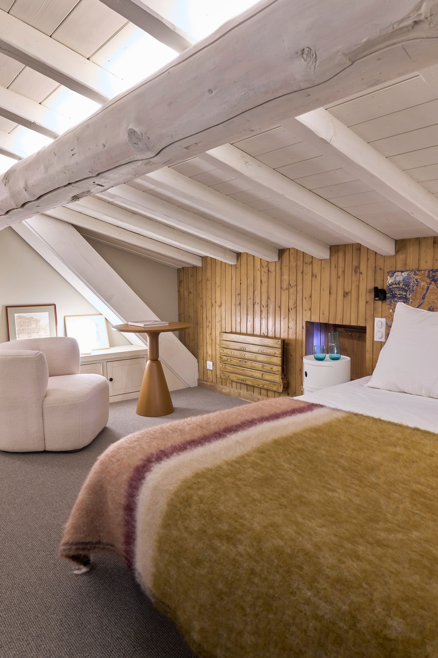 Vier separate Schlafzimmer bieten Flexibilität für verschiedene Gruppen. Das erste, das von der Küche aus zugänglich ist, verfügt über ein 140 cm breites Doppelbett und ein eigenes Duschbad mit WC. Das zweite verfügt über zwei Einzelbetten, die zu einem Doppelbett zusammengestellt werden können, ein eigenes Badezimmer mit Badewanne, jedoch ohne WC, und ein Zwischengeschoss mit zwei zusätzlichen Einzelbetten. Im Obergeschoss dient das dritte Zimmer als Kinderzimmer mit niedrigen Decken und zwei Einzelbetten, während das gegenüberliegende Hauptschlafzimmer über ein Duschbad und viel Stauraum verfügt und durch einen charmanten Balken geprägt ist. Ein separates WC befindet sich im Flur neben dem Hauptschlafzimmer.