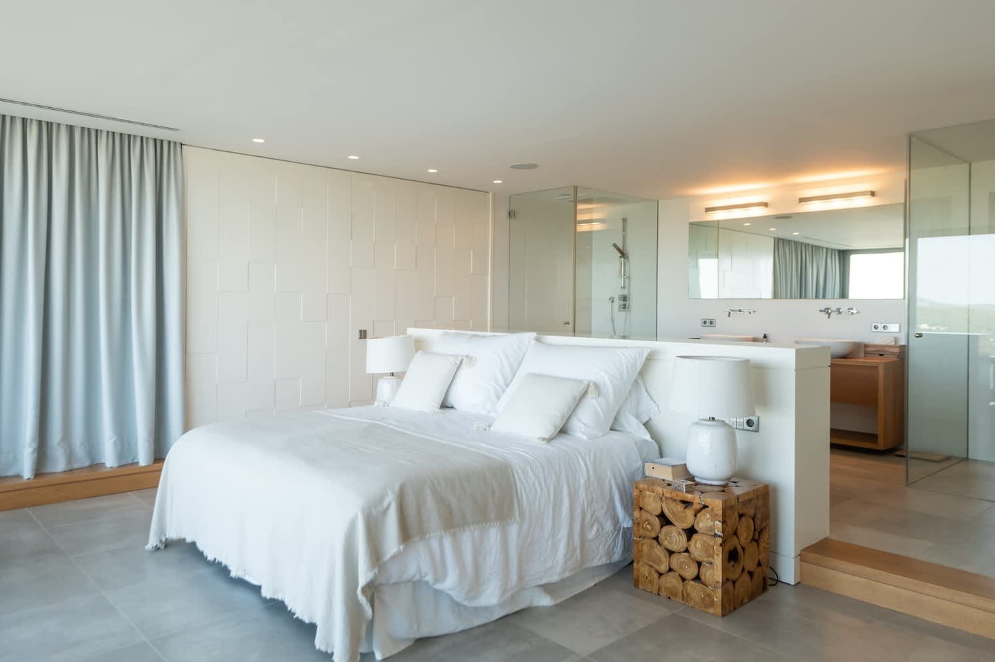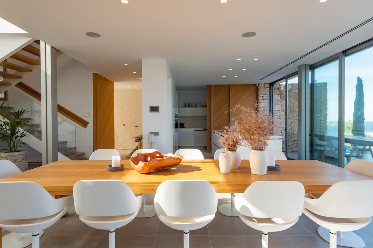 Dank der Lage sind drei unterschiedliche Strände leicht zu erreichen. Cala Moli liegt am nächsten, gefolgt vom familienfreundlichen Cala Tarida und der geschützten Bucht Cala Vadella. Jeder Strand hat seinen eigenen Charakter, von Strandclubs bis hin zu Restaurants am Wasser. Zurück in der Villa finden die Tage ihren eigenen Rhythmus zwischen Pool, Terrasse und dem faszinierenden Blick über das Wasser.