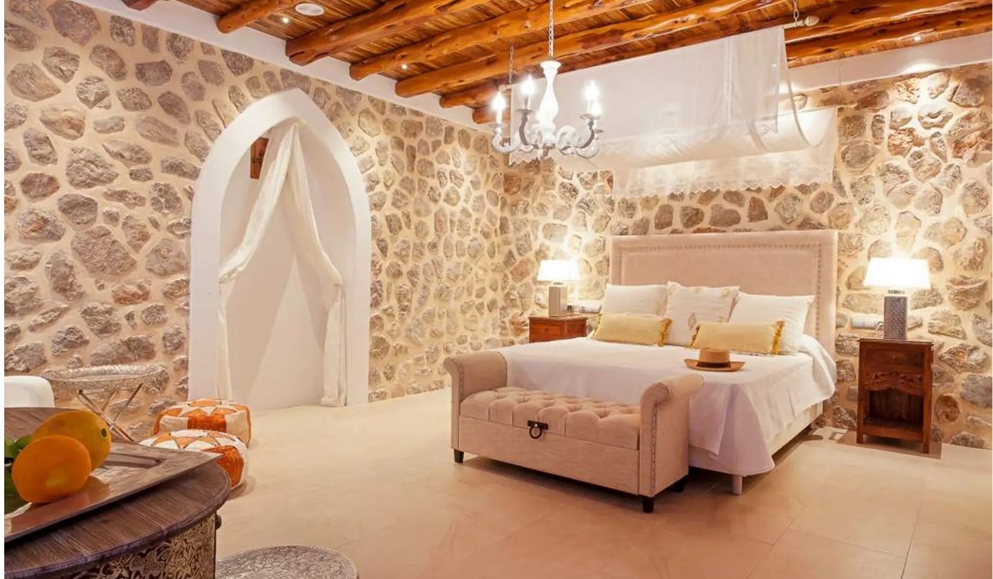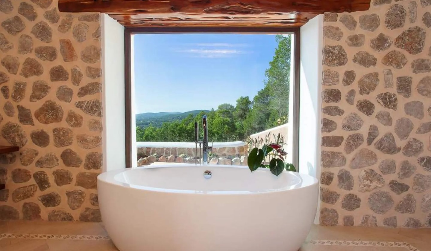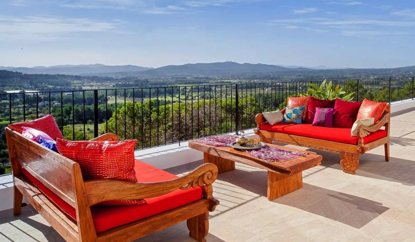 Die Villa Morna Valley liegt hoch am Berghang und überblickt das darunter liegende Tal und die Hälfte von Ibiza. Dieser Rückzugsort mit fünf Schlafzimmern besticht nicht durch großartige Gesten, sondern allein durch seine Lage, von der aus sich die Landschaft in alle Richtungen erstreckt. Das Anwesen kombiniert marokkanische Designelemente mit praktischen Außenbereichen, darunter ein 11 x 5,5 Meter großer Pool und eine voll ausgestattete Außenküche, die so positioniert ist, dass man den Panoramablick optimal genießen kann.
