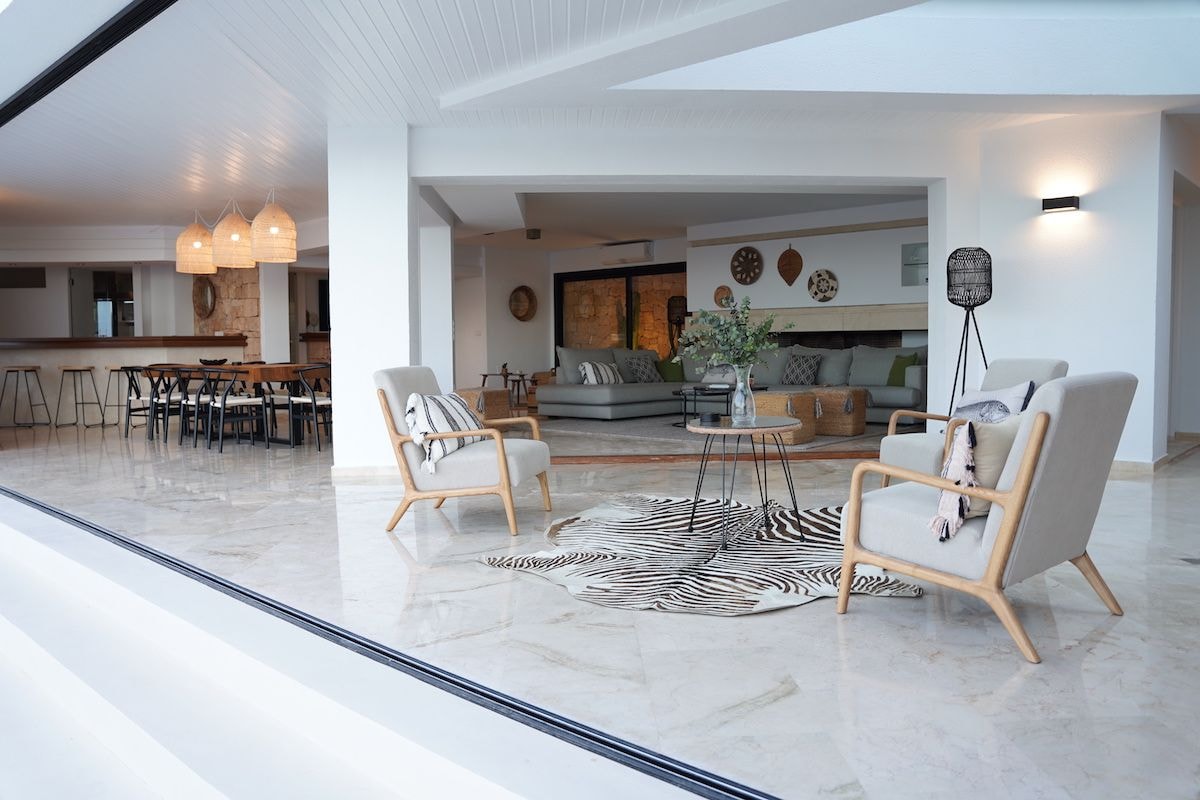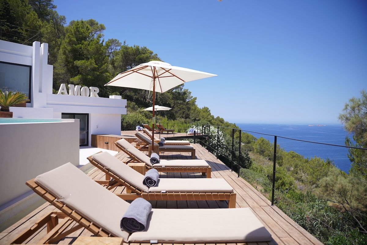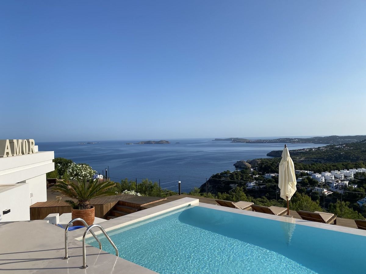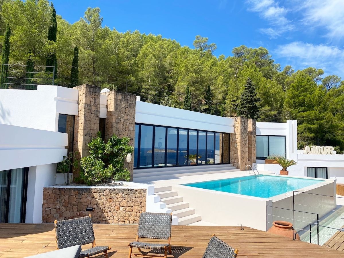 Villa Amor watches over the Mediterranean from its clifftop position near Cala Carbó, where the western coastline of Ibiza meets the sea. This six-bedroom property sits on 10,000 square metres of private grounds, offering panoramic views that stretch across the water. The villa underwent a complete renovation in 2022, bringing together Mediterranean architecture with modern comforts across 450 square metres of living space.