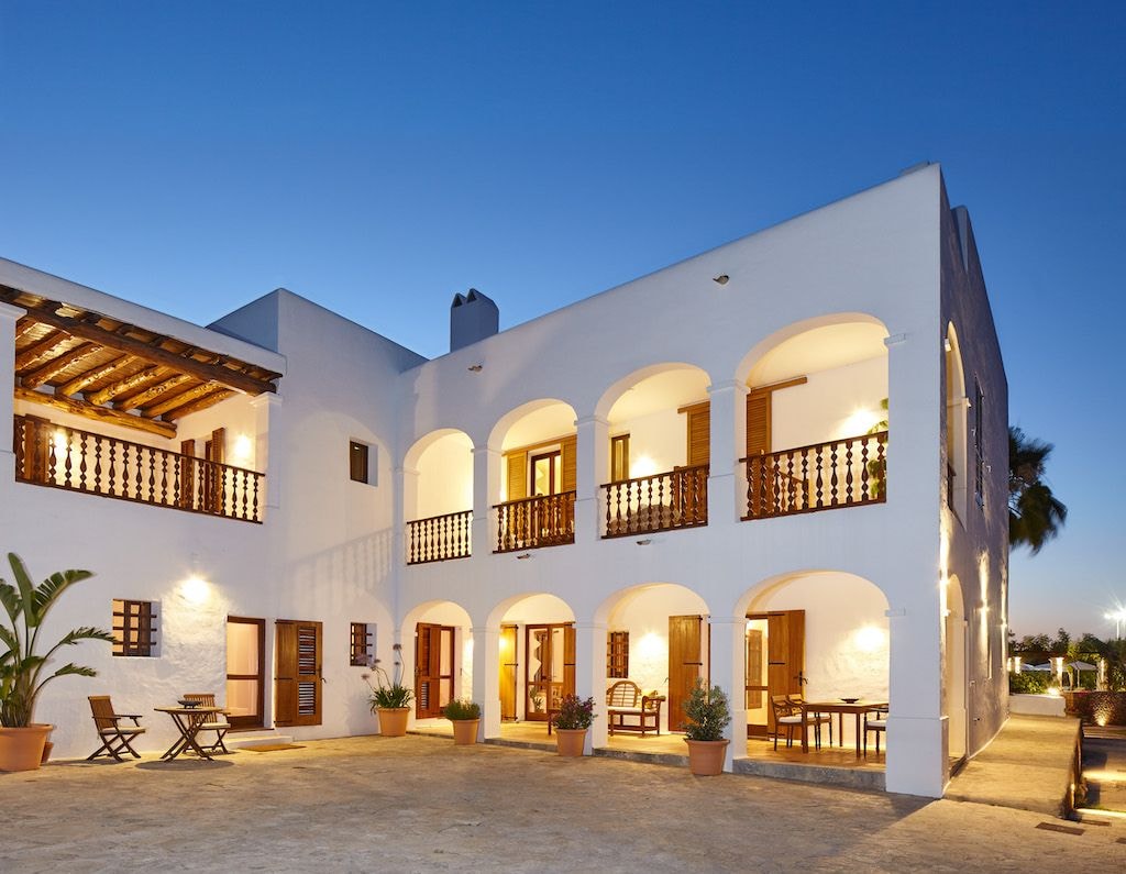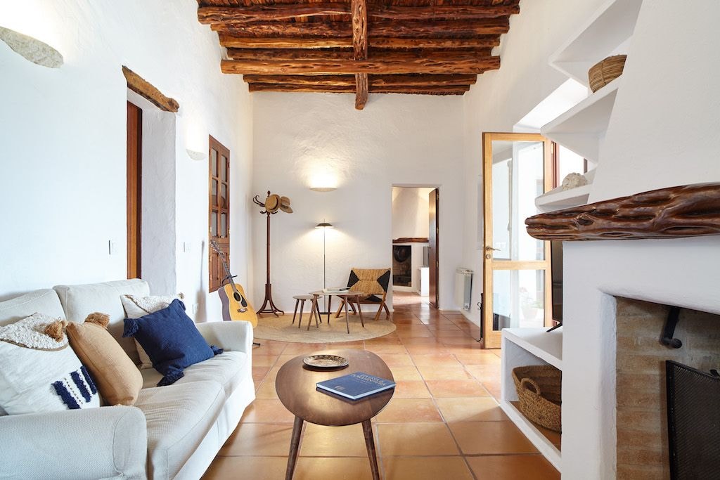 The main house contains six bedrooms, each finished with warm wooden accents that reflect traditional Ibicencan style. The separate annex adds three more bedrooms, allowing the villa to comfortably house up to seventeen guests. Throughout both buildings, modern conveniences blend with rustic charm. Air conditioning keeps rooms cool, while amenities like satellite TV, WiFi, and a well-equipped kitchen ensure comfort without compromise.