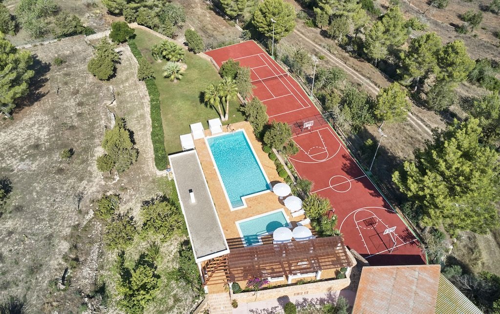 Outside, the facilities match the villa's generous proportions. A large swimming pool forms the centrepiece, accompanied by a children's pool with jacuzzi. Tennis and basketball courts occupy their own corners of the grounds, while multiple dining areas and chill-out spaces dot the gardens. Two outdoor bathrooms and a changing room with shower serve the pool area, where sunbeds and canopies provide spots for relaxation beneath the Ibicencan sun.