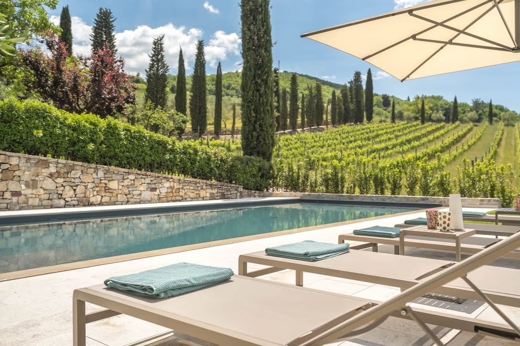 A restored stone farmhouse just a stroll from Radda in Chianti, where Tuscan tradition meets refined comfort. Five bedrooms, private pool, and panoramic views across the rolling hills.