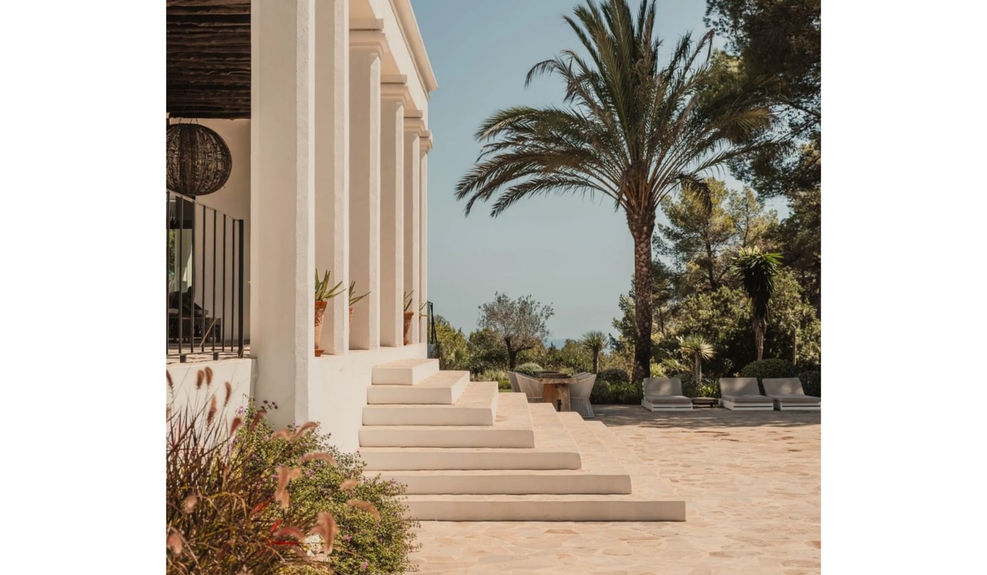 The Mediterranean gardens wrap the property in palms, pines and mimosa trees, with lemon trees dotting the patio spaces. Two colonnaded terraces provide shaded spots throughout the day, while the pool terraces catch sun from morning to evening. The location puts you minutes from the renowned restaurants along the Sant Joan road, including Bambuddha Grove and La Paloma, with Ibiza Town easily accessible for day trips or evening adventures.