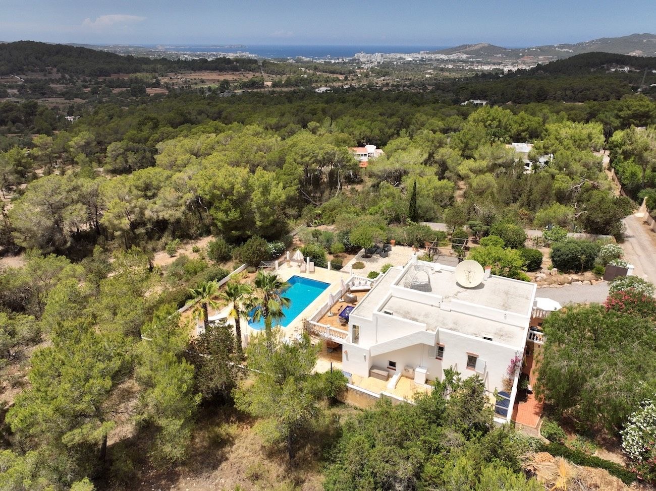 From here, San Antonio lies just 10 minutes away by car, while the crystalline waters of Cala Bassa and Cala Conta can be reached in 15 to 20 minutes. Ibiza Town, with its walled old quarter and harbour restaurants, is a 20-minute drive. Back at the villa, days move at your own pace, whether that means poolside afternoons or exploring the island's hidden beaches and pine-scented hiking trails.