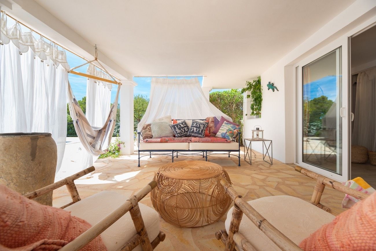 Bohemian touches appear throughout the interiors, from colourful textiles to carefully chosen decorations that nod to Ibiza's hippie heritage. The living room opens onto a terrace with dining table and chill-out area, while the rooftop terrace offers sunset views across the landscape. Outside, the pool sits at the heart of a well-tended garden, with a BBQ area ready for long evenings under Mediterranean skies.