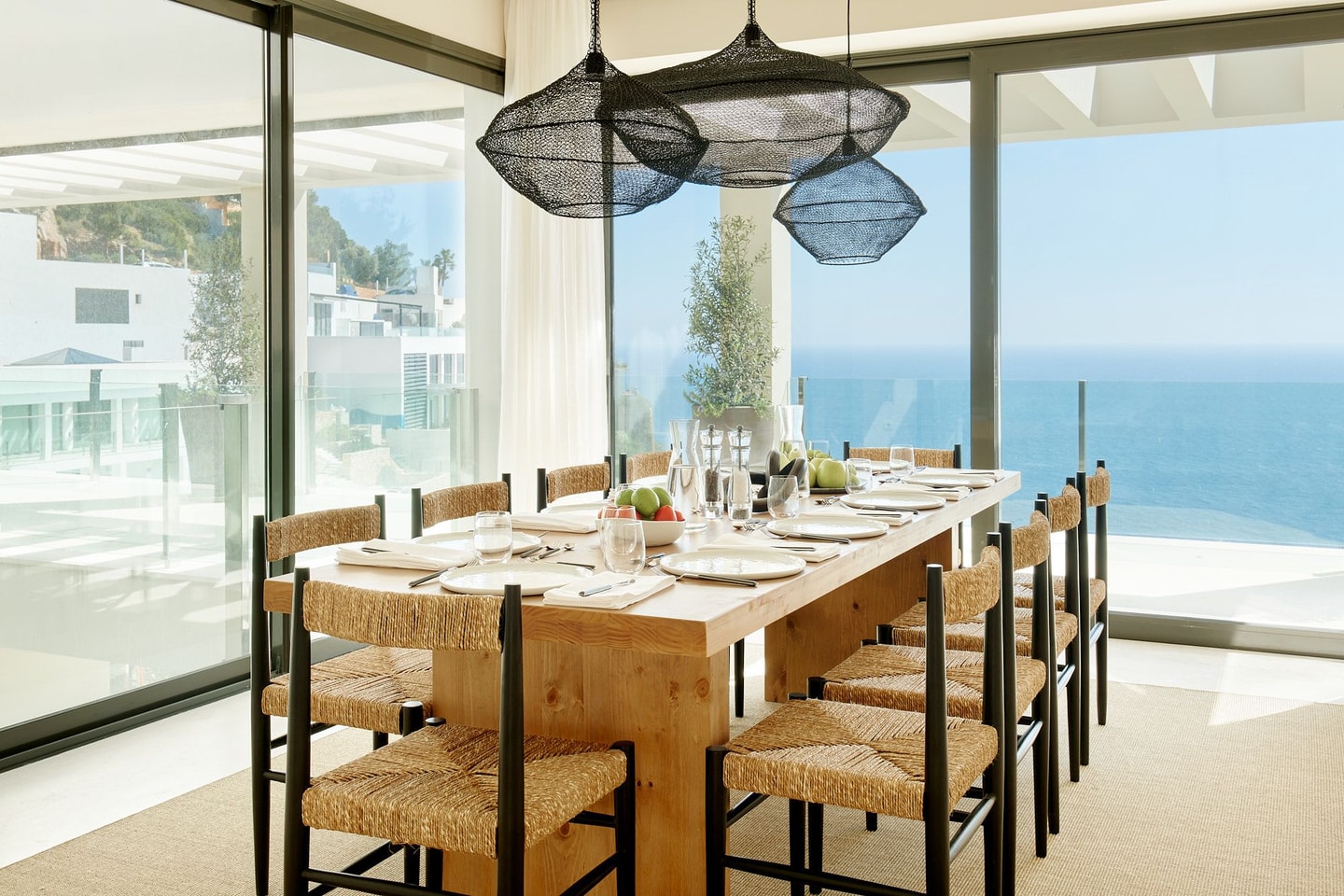 Casa Olalla claims one of Roca Llisa's most striking positions, where modern architecture meets the Mediterranean's endless blue. This 14-guest villa rises from the rocky coastline, its clean lines softened by clusters of palm trees. The infinity pool appears to spill directly into the sea below, creating that rare visual trick where water meets water without interruption.