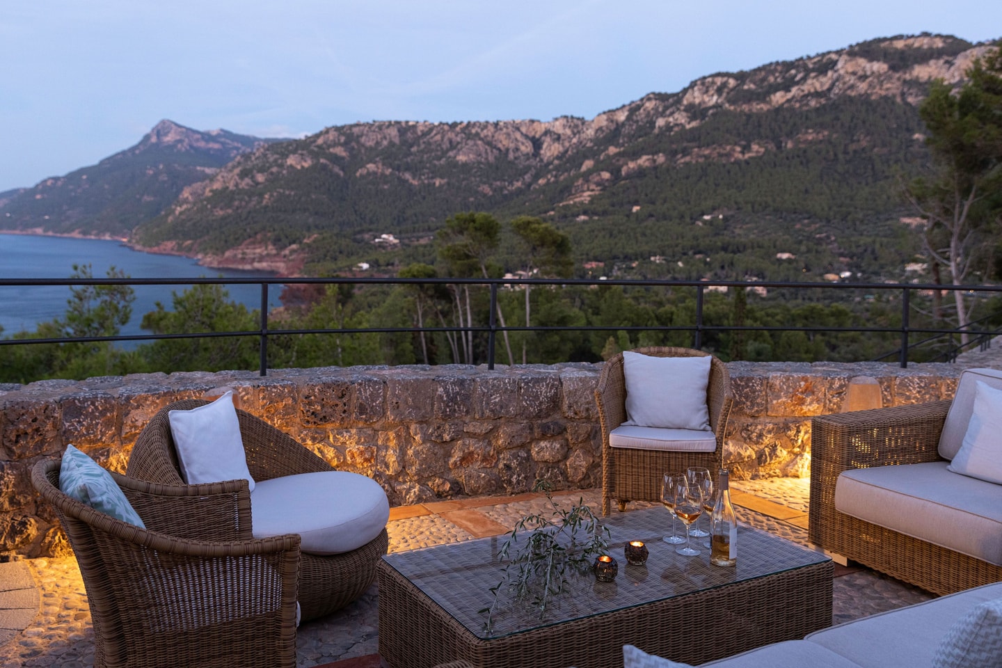 Days here unfold between poolside relaxation and exploring the rugged beauty of north-western Mallorca. The surrounding coastline offers hidden coves and dramatic cliff walks, while nearby villages provide authentic restaurants and weekly markets. Evenings naturally gravitate to the terrace, where dinner stretches long into the night as the sun sets over the Mediterranean, painting the sky in shifting colours above the water.