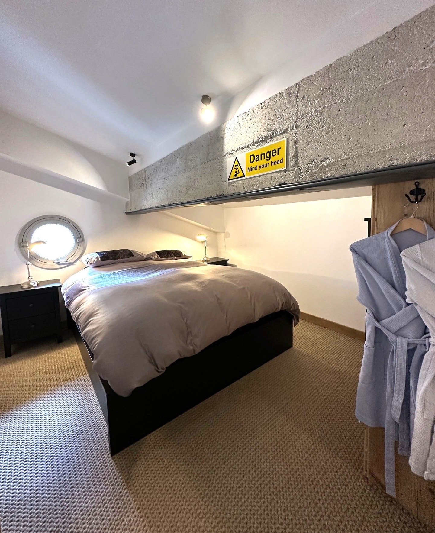 - King bed tucked perfectly into the wall space