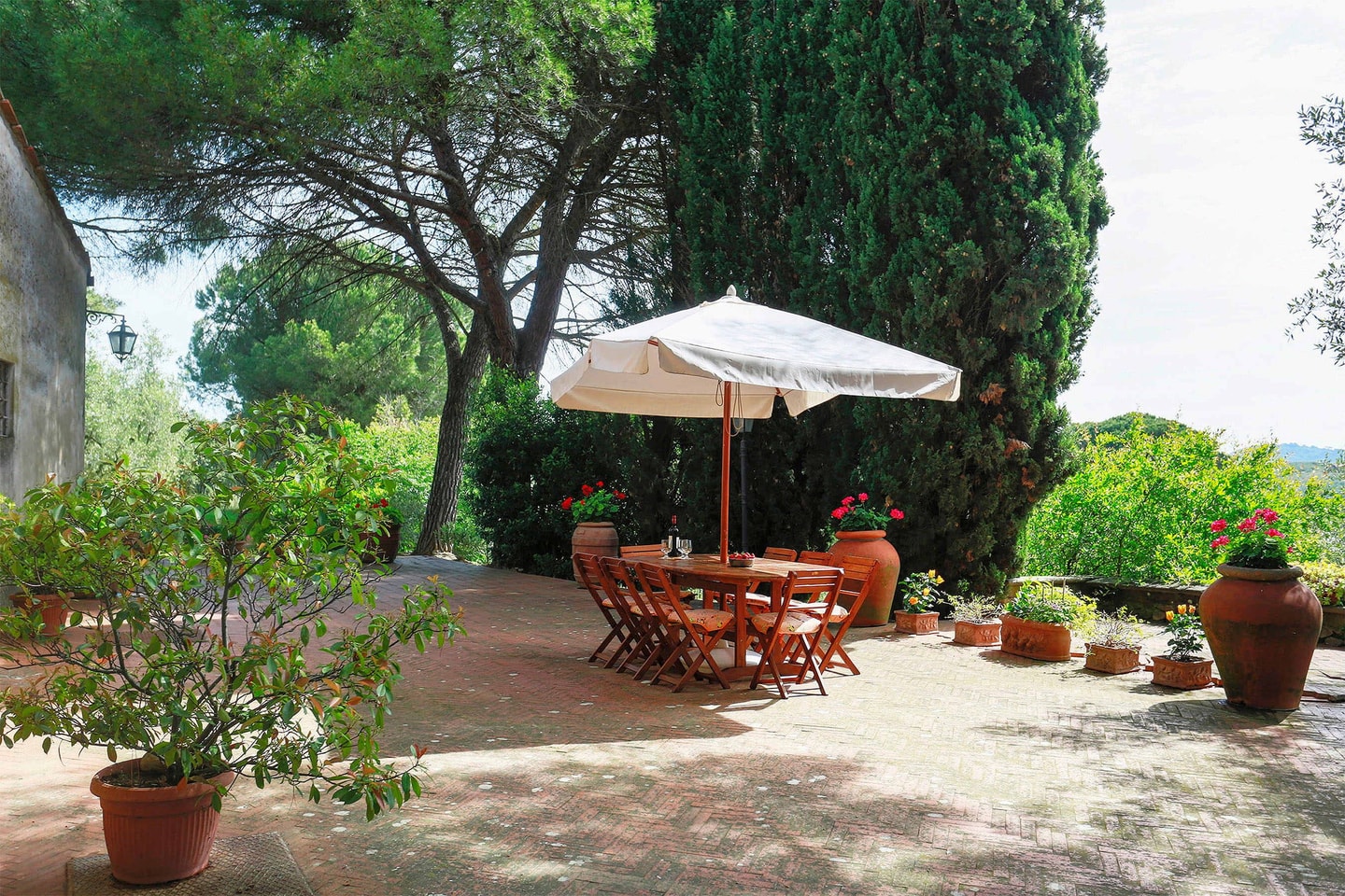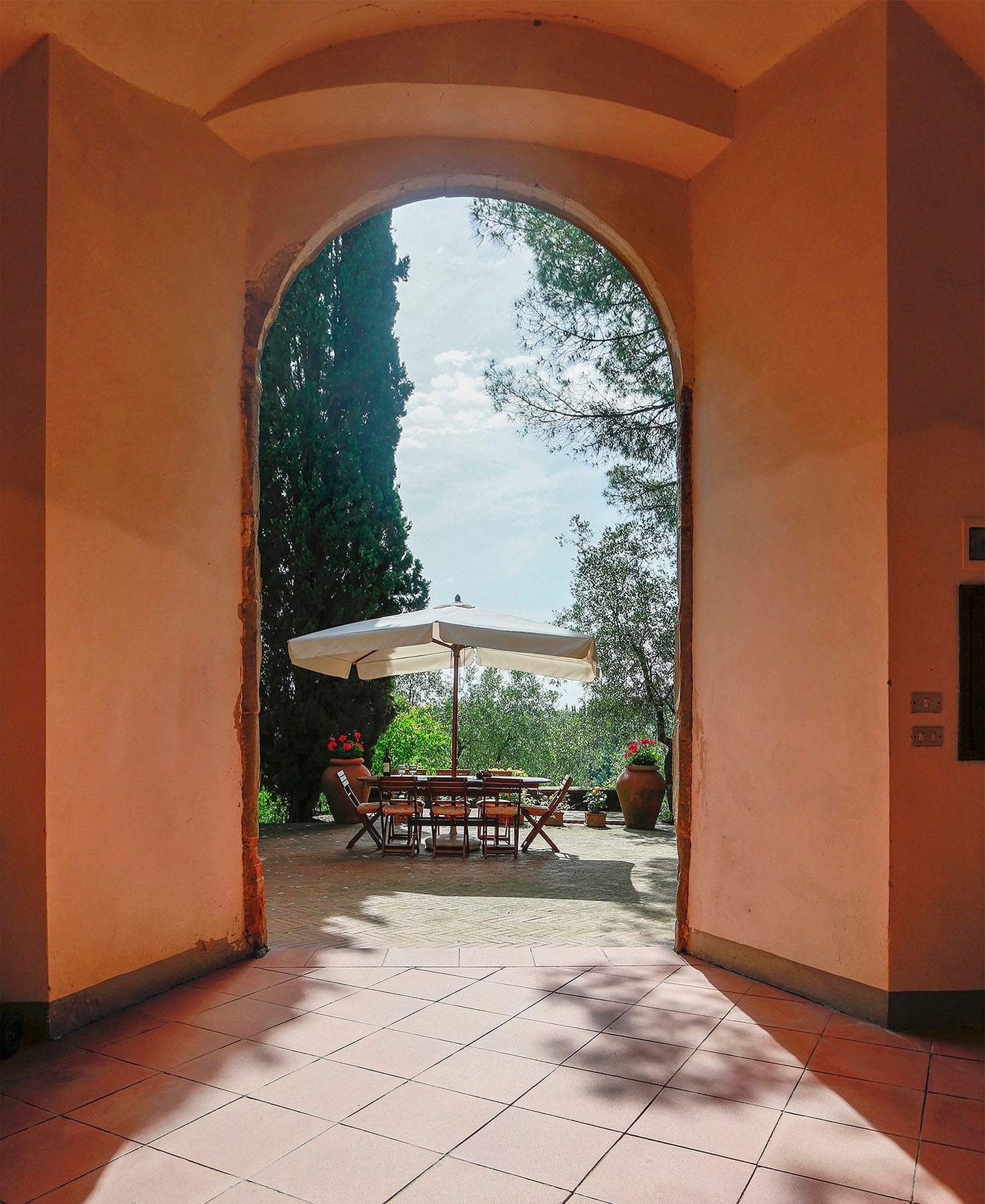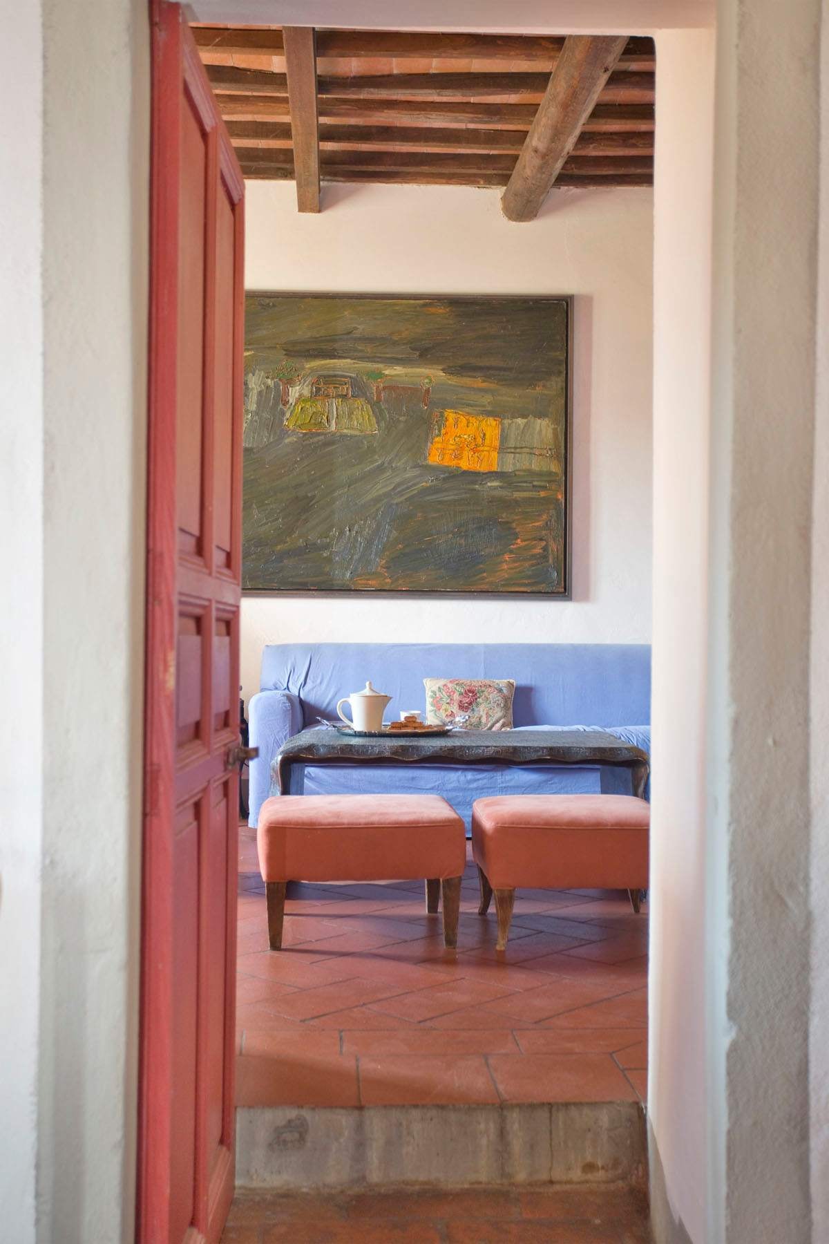 Outside, manicured gardens stretch towards a non-professional tennis court where afternoon matches unfold at a leisurely pace. The charming loggia at the entrance provides shade for long lunches, while another dining spot beneath an umbrella faces the house. A private pool offers respite from Tuscan summers, surrounded by panoramic views.