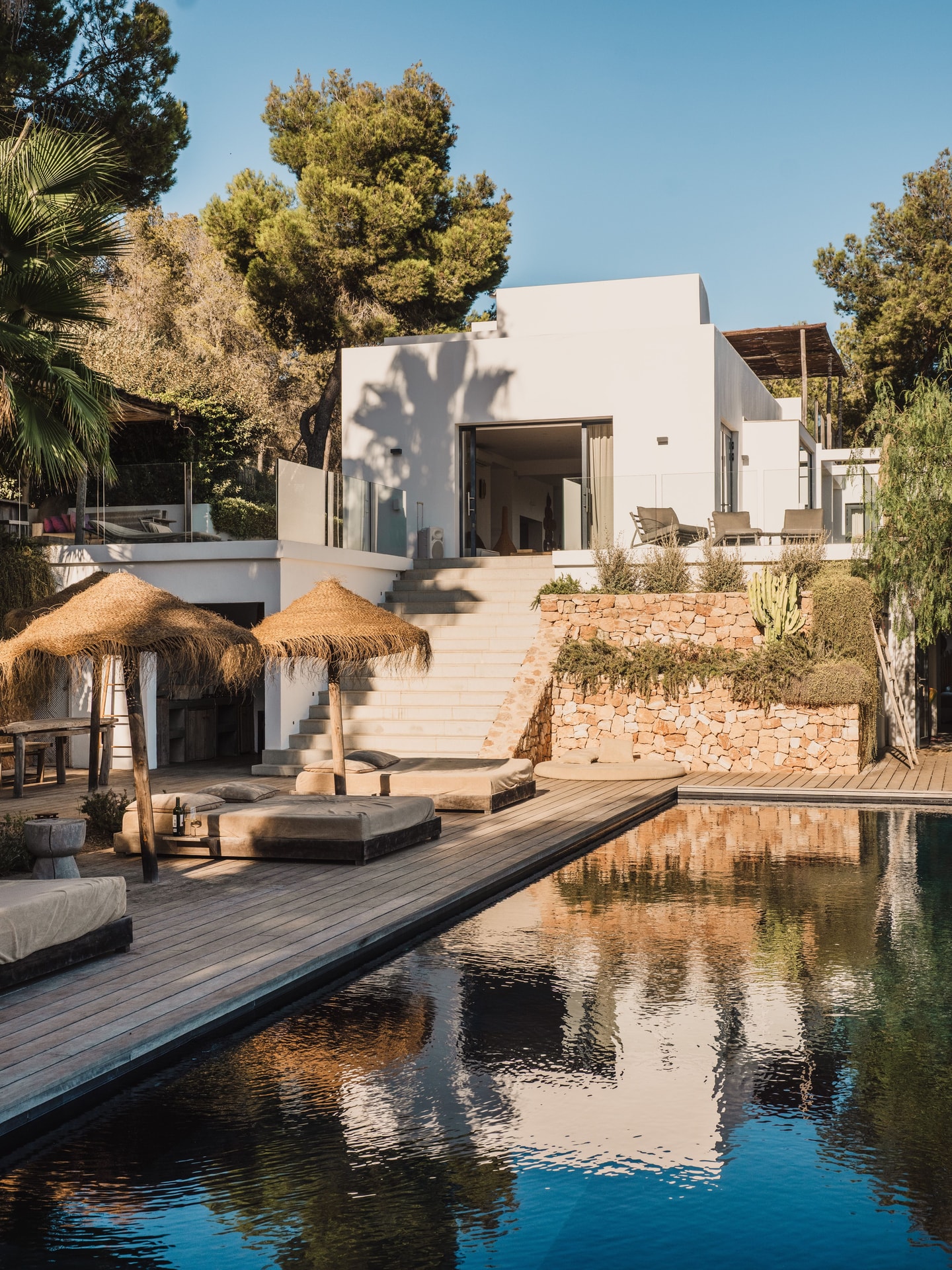 A minimalist villa tucked into the hills above Es Cubells, where pine-scented privacy meets sweeping views of Cap des Falco and the Mediterranean. Five bedrooms spread across three levels, each with its own perspective.