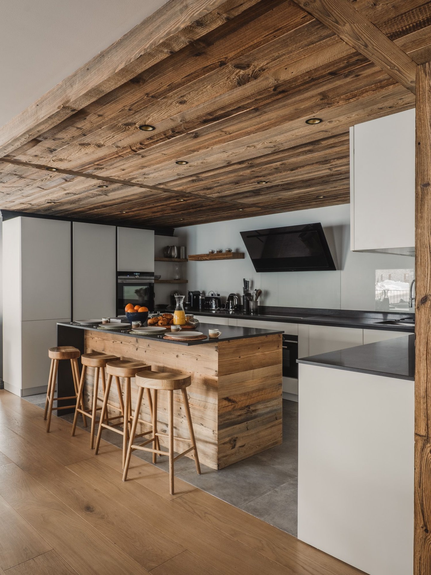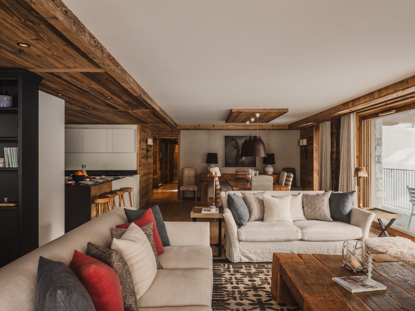 Step inside to find an entrance hall with a practical cloakroom for all your winter gear. The apartment unfolds into a generous open-plan space where kitchen, dining and living areas merge. Ten upholstered chairs gather around a natural wood dining table, while the kitchen features a breakfast bar with four stools, double ovens and two fridges. A Nespresso machine, juicer and modern appliances complete the setup.