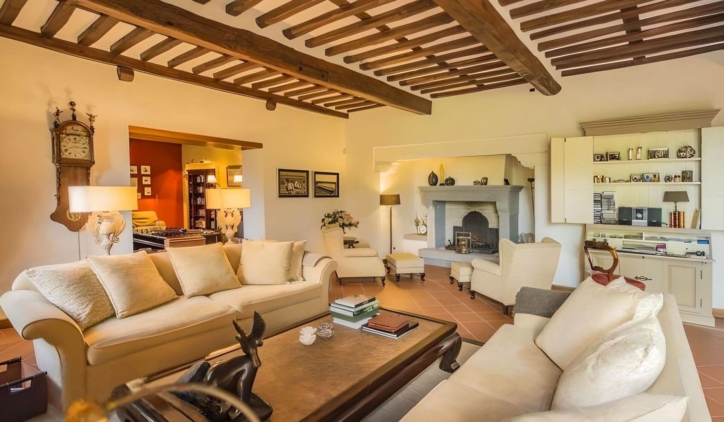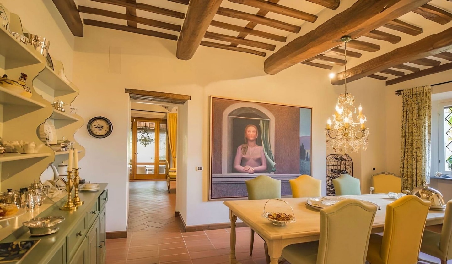 A 17th-century villa sits quietly among the Tuscan hills, just eight minutes from Lucca's medieval walls. This historic property spans 400 square metres across two levels, with a separate guest house near the pool. The main residence houses five bedrooms and maintains its original character while offering modern comforts like air conditioning and a well-equipped kitchen.