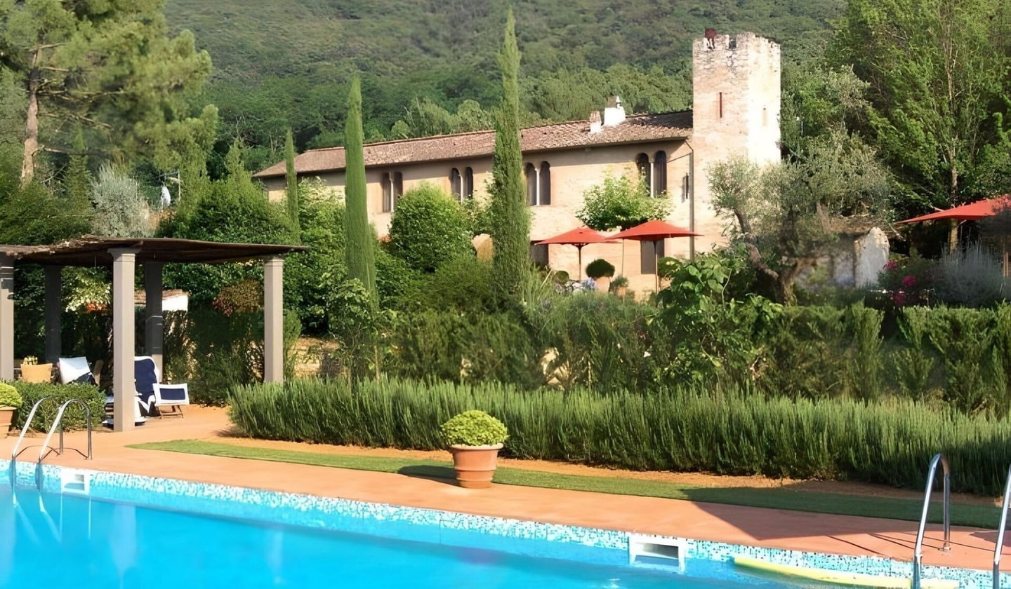 A 17th-century Tuscan villa with private tennis court and pool house, just minutes from Lucca. Historic elegance meets modern comfort across manicured grounds with ancient olive trees.