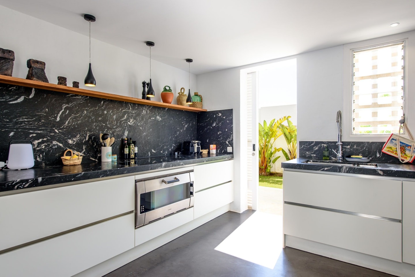 The interior spaces have been thoughtfully designed with comfort in mind. Air conditioning throughout keeps things cool during warm Mediterranean days, while the underfloor heating and fireplace ensure cosy evenings when temperatures drop. The modern kitchen comes equipped with everything you'd expect: dishwasher, oven, microwave, induction plates, plus extras like a coffee maker, blender and juicer for morning smoothies.