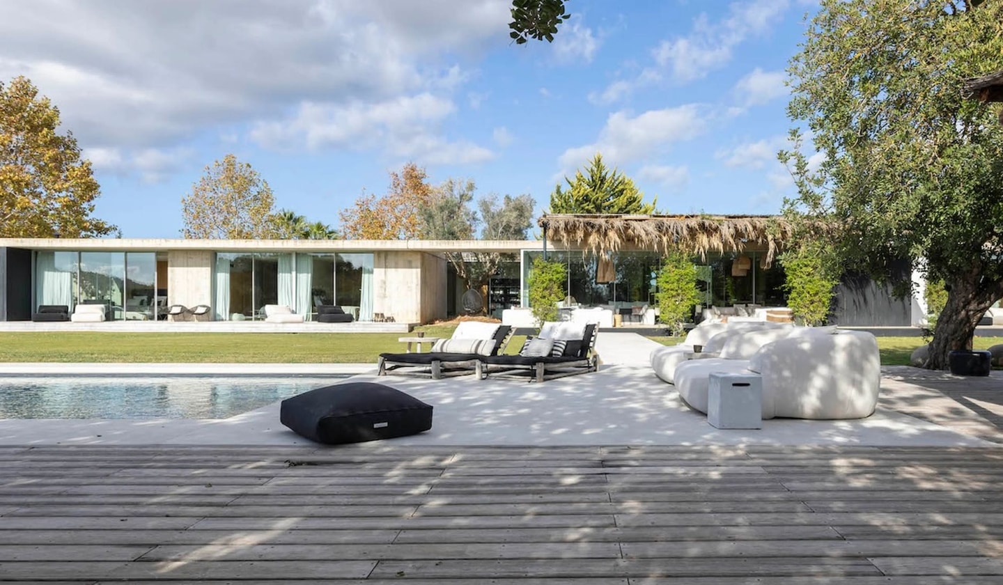 Villa Friends presents a striking contrast to Ibiza's typical white-washed architecture. This recently built black villa in the Atzaro Valley, positioned between San Lorenzo and Santa Eularia, makes quite the statement. The surrounding landscape feels unexpectedly wild, with vegetation that could easily belong to an African savanna rather than the Mediterranean. It's a bold choice that works brilliantly.