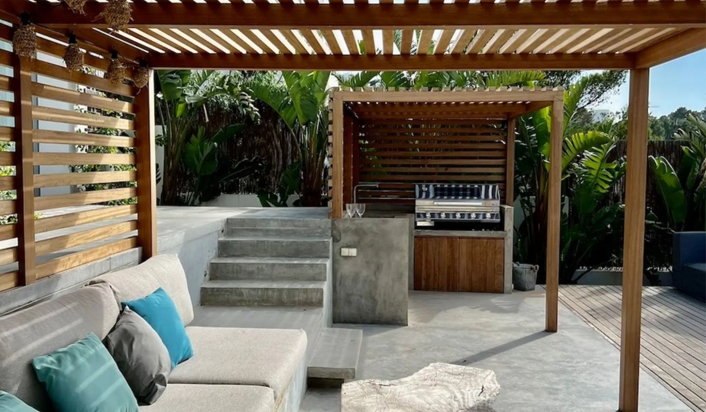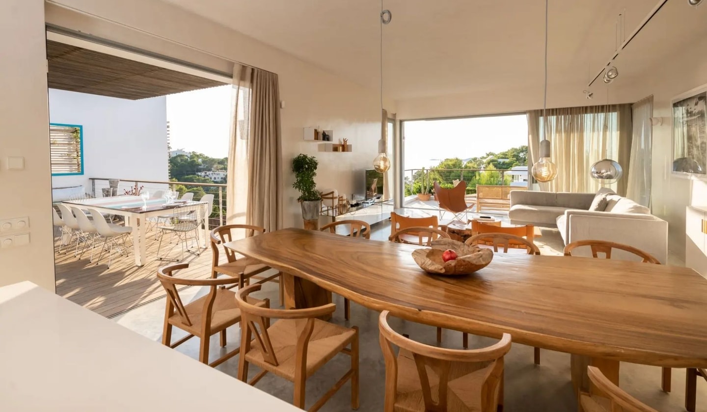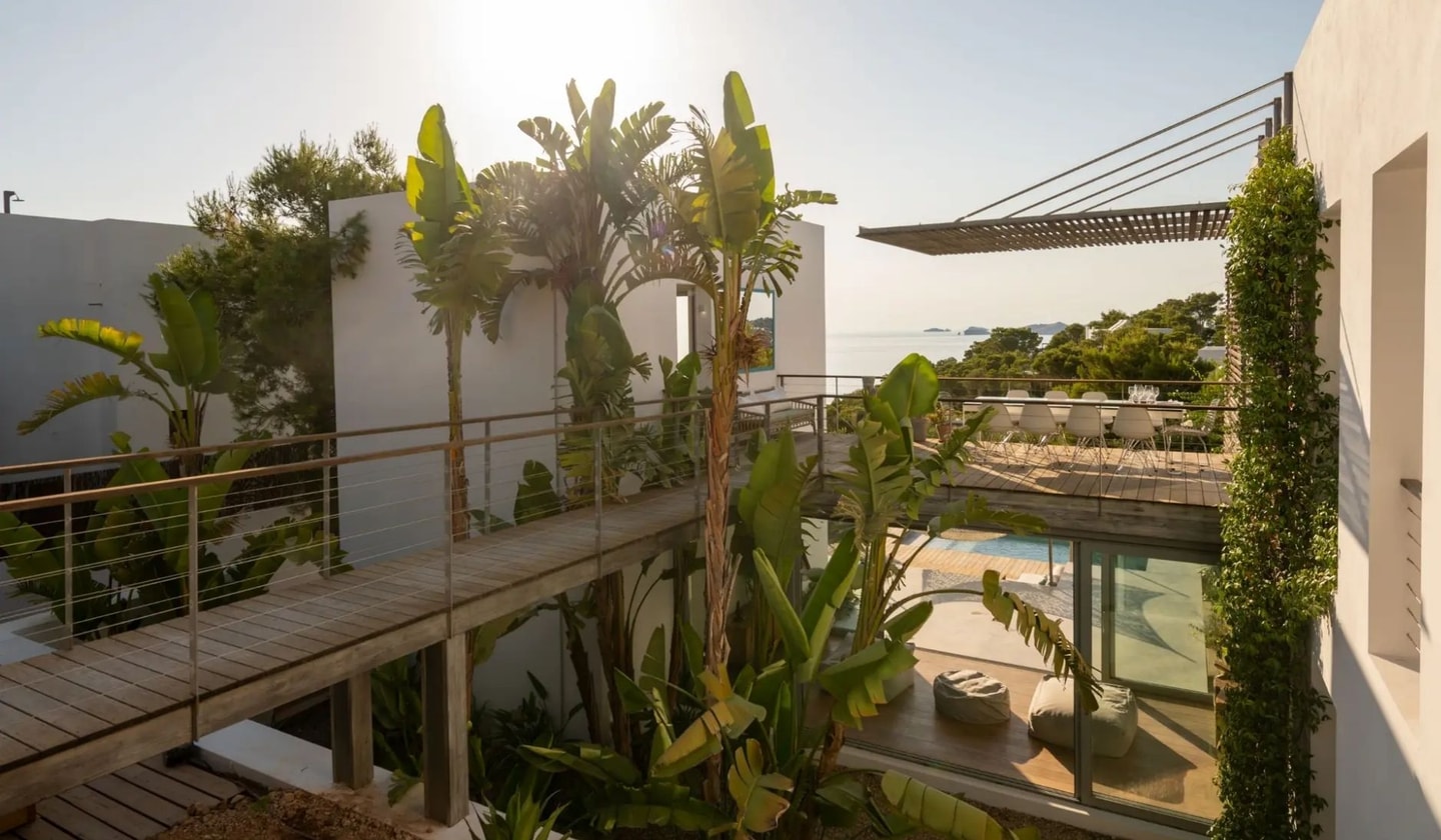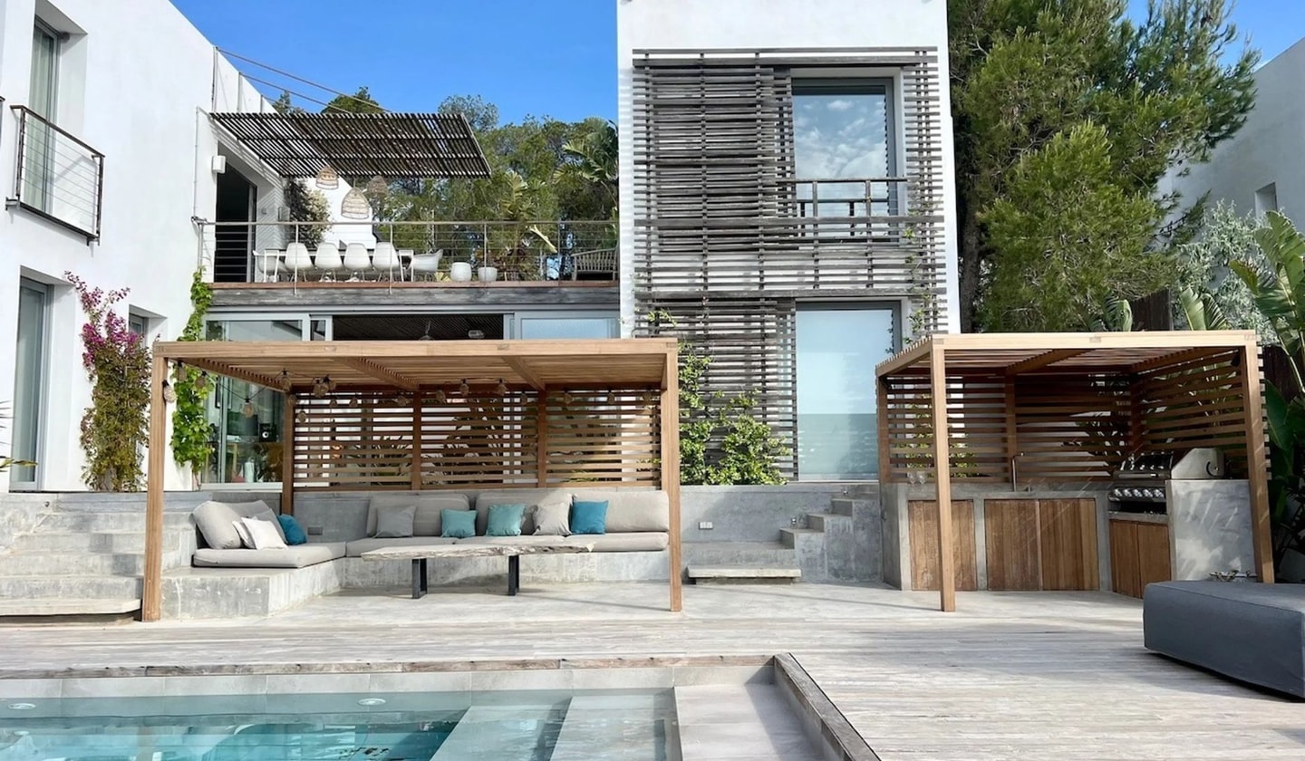Five bedrooms, panoramic sunset views, and Balinese artistry come together in this modern villa. Just minutes from Ibiza's most beautiful beaches, with a heated pool and projection room for perfect island days.