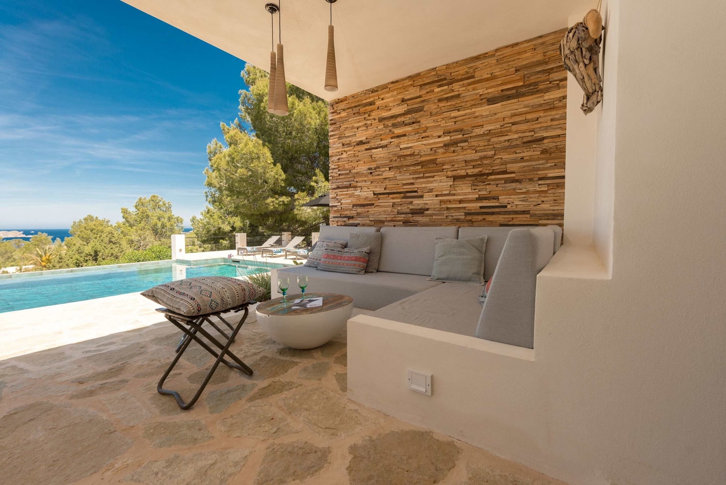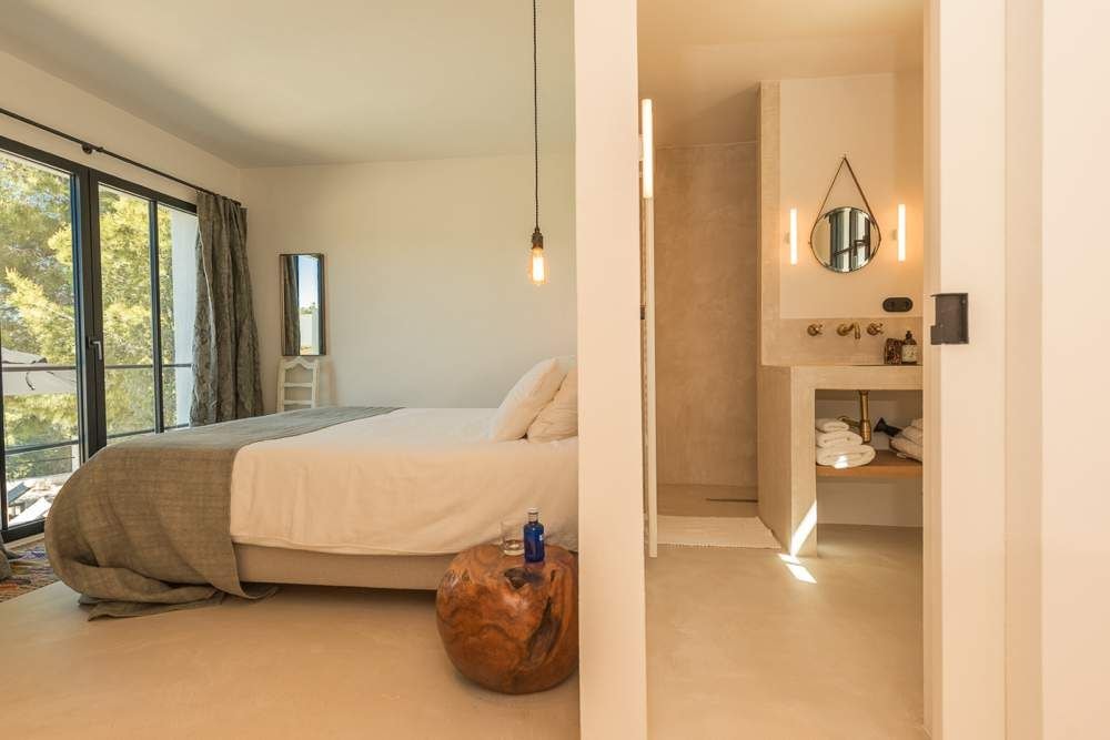 Villa Passion sits on a hillside near Cala Tarida, where the Mediterranean stretches out before you in an uninterrupted panorama. This recently renovated family home offers five bedrooms across its thoughtfully designed layout, with the kind of privacy that lets you truly switch off. The location strikes that perfect balance: residential calm with complete seclusion, yet just ten minutes from the beach.