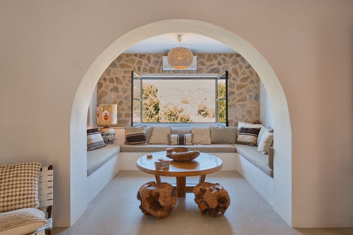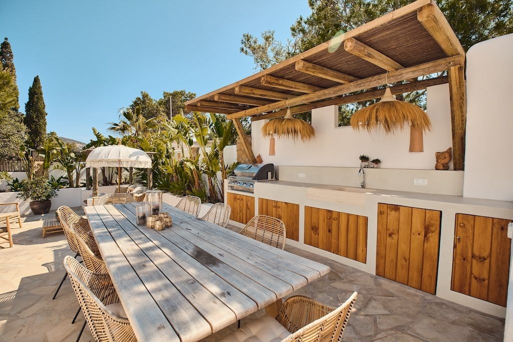 Vier tweepersoonskamers met eigen badkamer en een keuken die zowel naar binnen als naar buiten opent, maken deze villa in Cala Carbó bijzonder geschikt voor groepen die zowel gezelligheid als privacy waarderen. Het terrein biedt een direct uitzicht op Es Vedrà, de opvallende rotsformatie die uit de zee oprijst, terwijl de westelijke ligging een eersteklas plek garandeert voor de beroemde zonsondergangen van Ibiza.