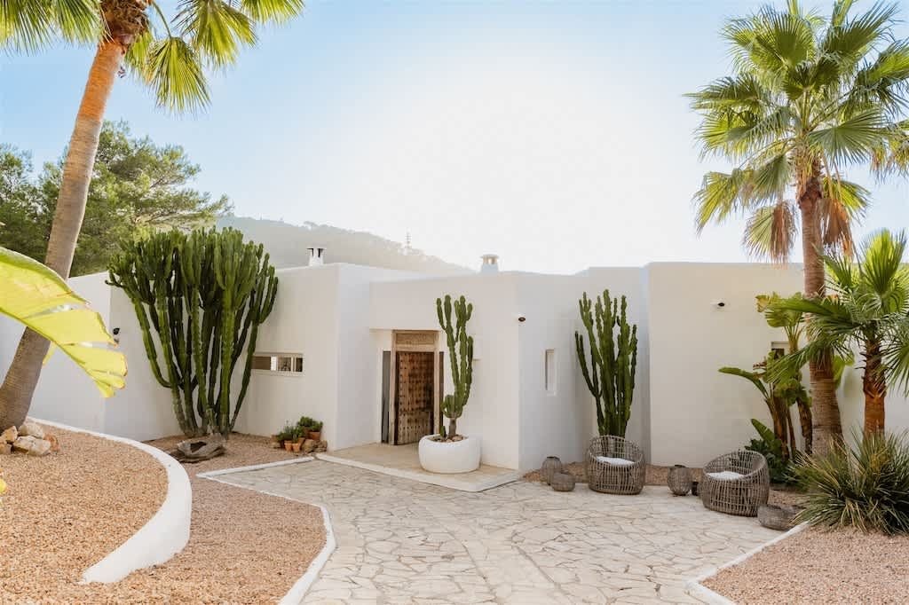 De woonkamer is opgebouwd rond een open haard, met een eethoek die overloopt in een grote open keuken met vaatwasser, oven, magnetron en inductiekookplaten. Het hoofdgebouw heeft drie slaapkamers, waarvan twee met een eigen badkamer met een uniek ontwerp. Een apart gastenverblijf voegt een vierde slaapkamer toe met een eigen ingang, een eigen badkamer en een terras met uitzicht op de Middellandse Zee. Airconditioning zorgt ervoor dat alle kamers comfortabel blijven tijdens de warme nachten op Ibiza.